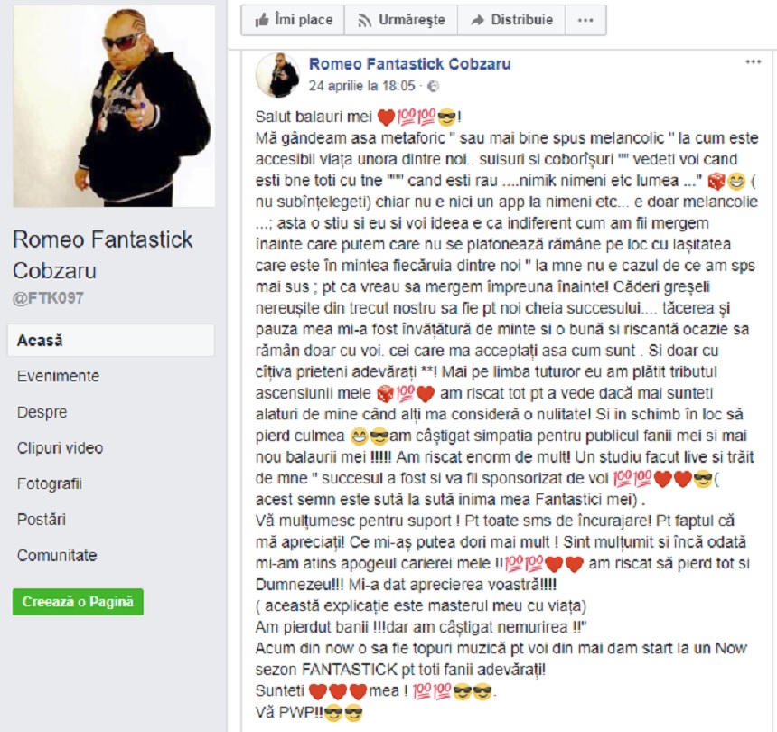 Celebrul manelist Romeo Fantastik a dispărut, pentru o perioadă, de pe piața muzicală românească. Cu toate acestea, artistul excentric păstrează permanent legătura cu fanii, prin intermediul rețelelor de socializare.