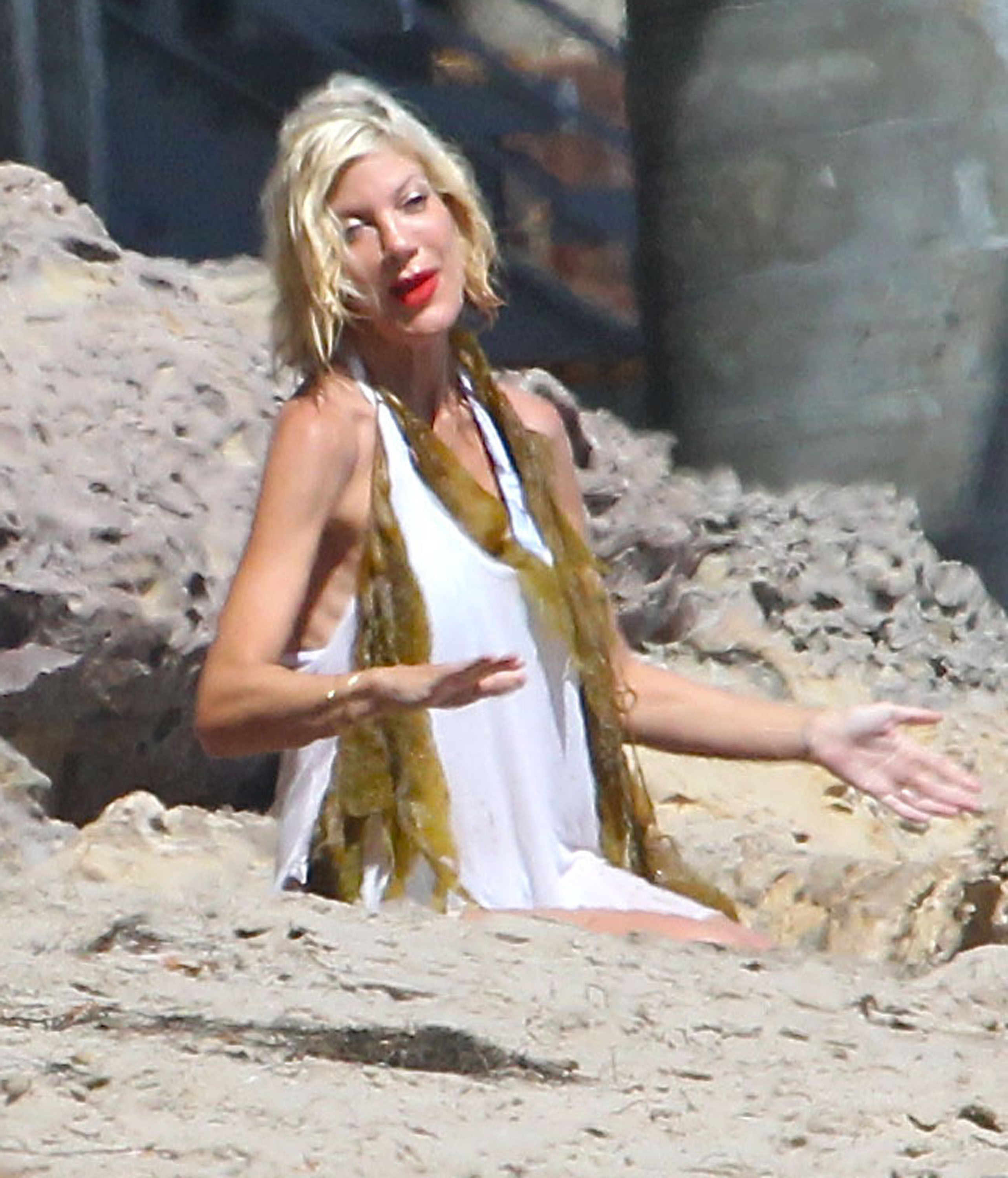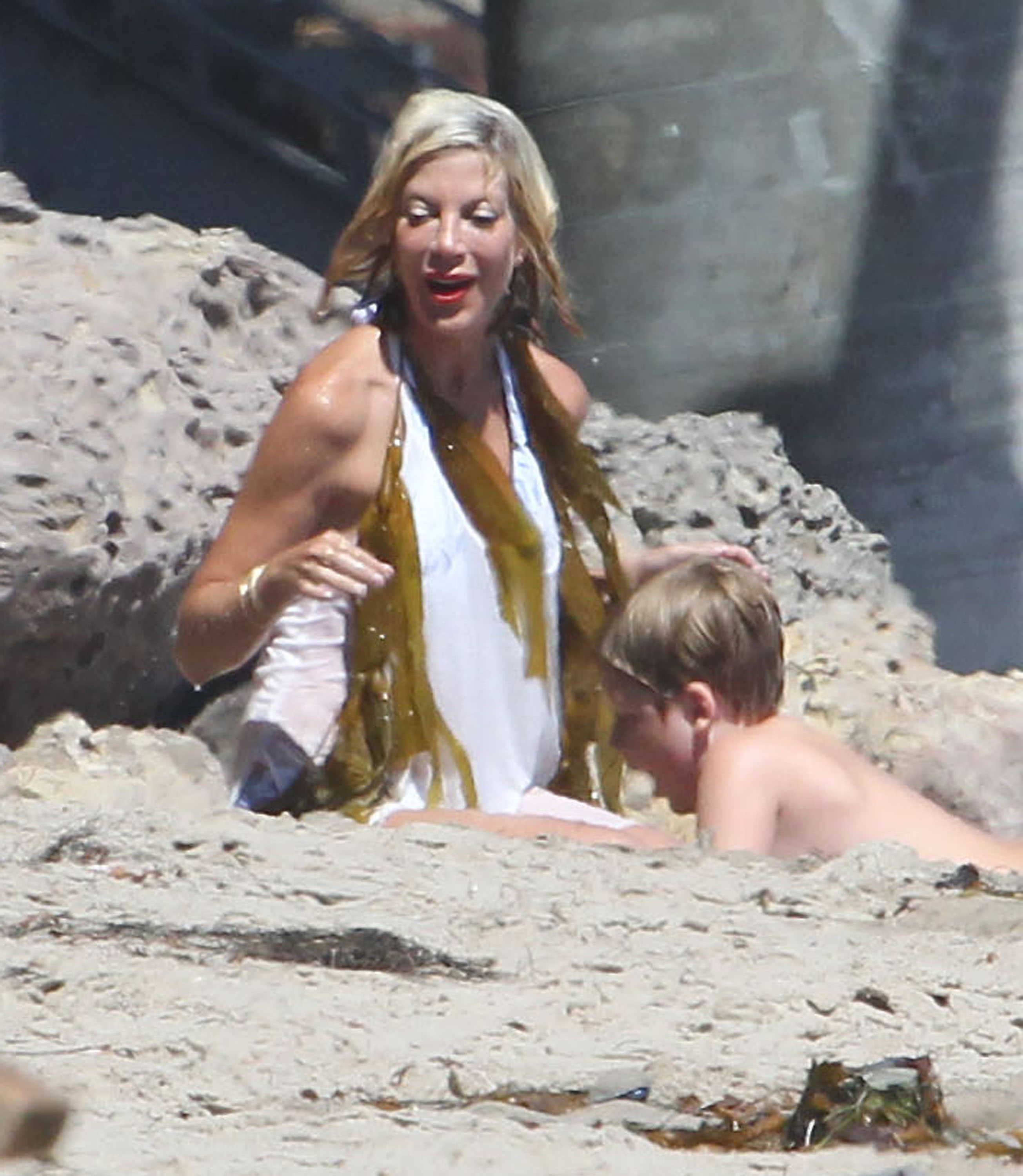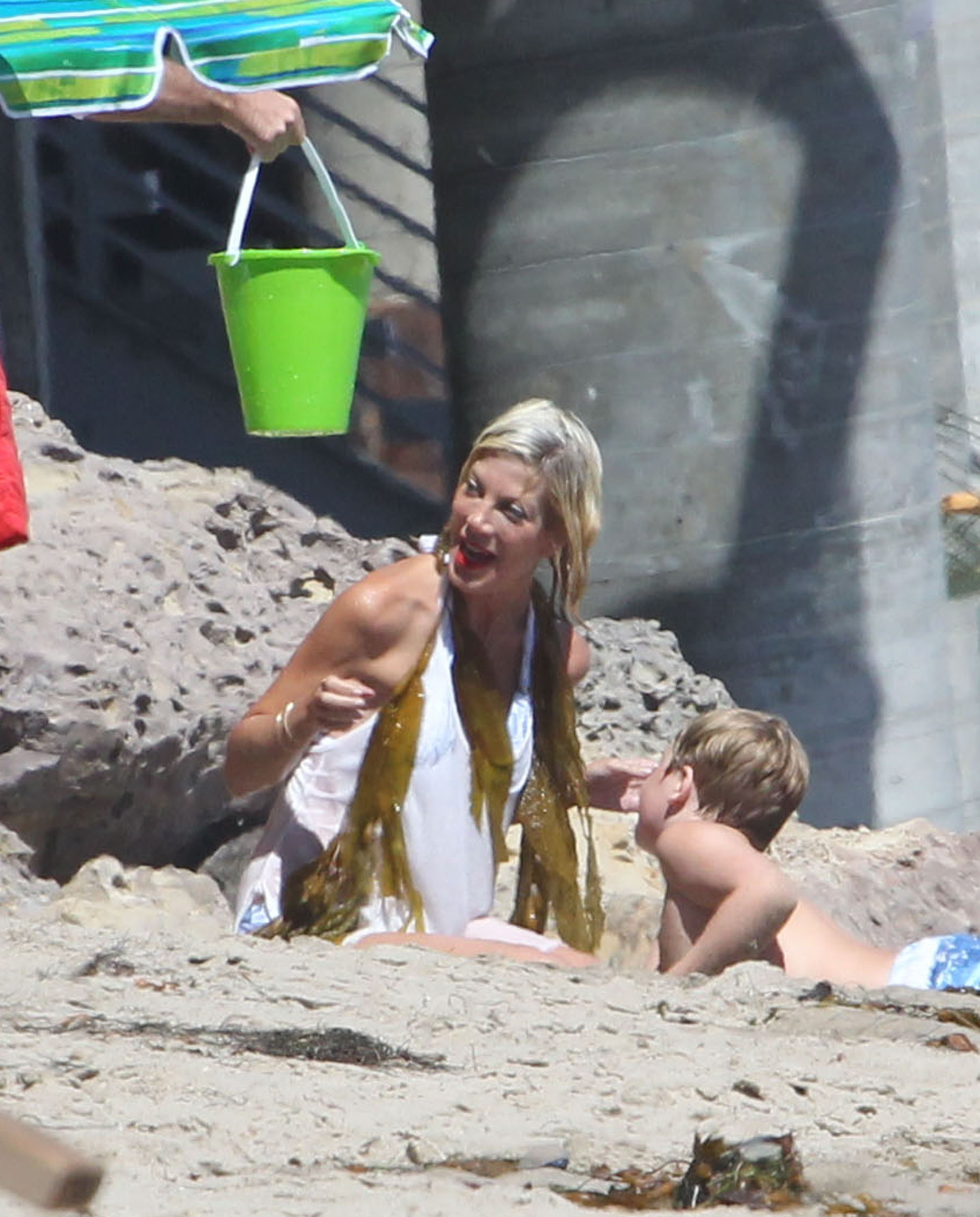 Cunoscuta actriţă Tori Spelling a fost surprinsă pe plajele din Malibu, California, alături de soţul ei, Dean McDermott şi 2 dintre copii lor. Blonda cunoscută pentru rolul Donnei Martin din serialul Beverly Hills 90210 a suferit schimbări majore odată cu trecerea anilor şi cele două sarcini pe care le-a avut.
