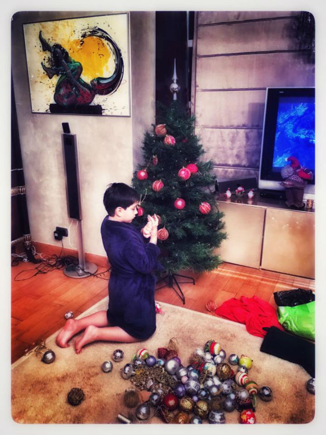 În sânul familiei şi într-o atmosferă de sărbători, fosta balerină lituaniană l-a fotografiat pe băiatul său în timp ce acesta punea globurile în brad. Toate globurile sunt împrăştiate pe covor.