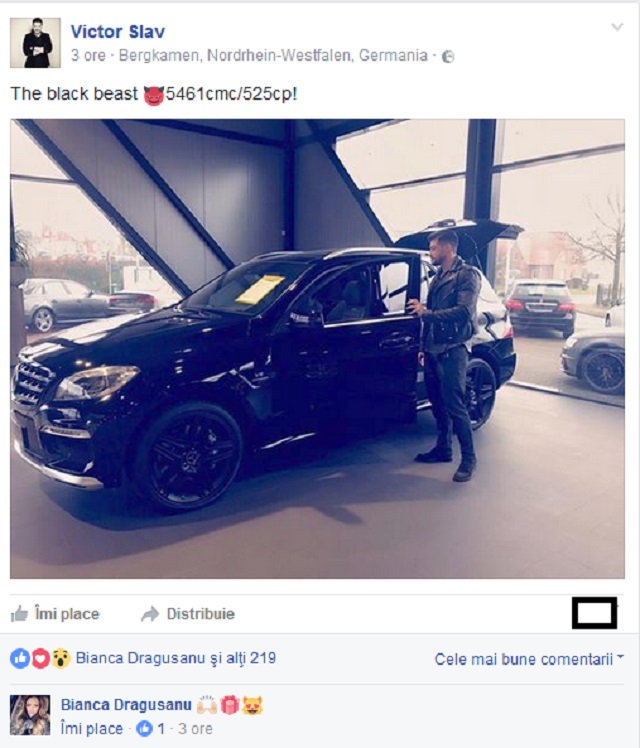 Blonda i-a comentat fostului prezentator cu nişte emoticoane, unul dintre ele fiind în formă de cadou. Cum acum două zile a fost ziua Biancăi, iar mâine este şi 8 martie, nu este exclus ca acesta să fie darul de la Victor, mai ales că fosta asistentă adoră cadourile scumpe şi sofisticate. Maşina are preţul unui apartament de 2 camere în Bucureşti.