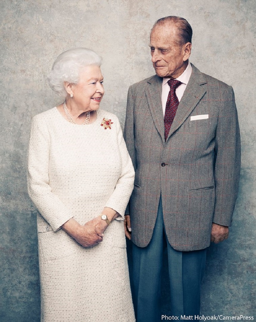 Regina Elisabeta a II-a a Marii Britanii şi Prinţul Philip au fost fotografiaţi zâmbitori, în ţinute lejere, şi cu un fundal de culoarea platinei în spate.