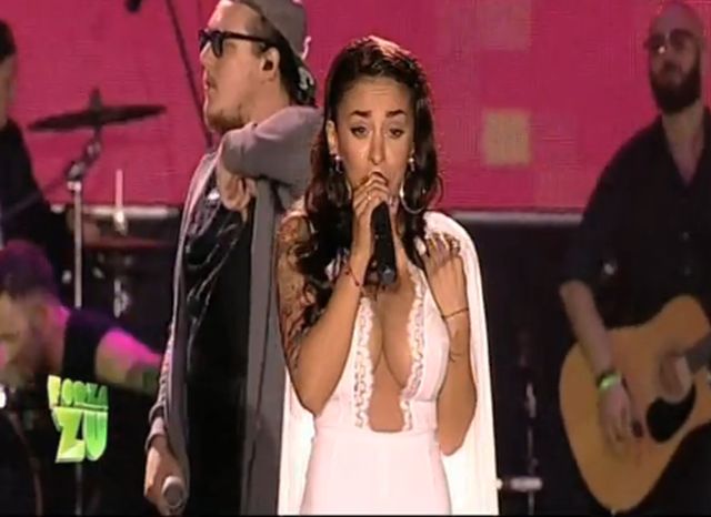 Artista a urcat pe scenă îmbrăcată într-o rochie lungă, dar care avea un decolteu impunător. Sânii siliconaţi ai cântăreţei au fost pe jumătate dezgoliţi, spre deliciul admiratorilor aflaţi la spectacol.