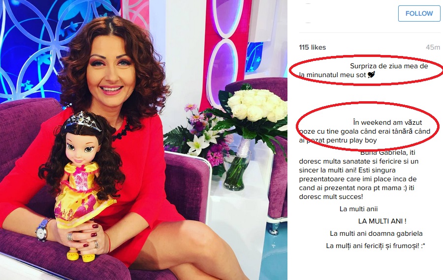 "Surpriza de ziua mea de la minunatul meu soţ", este mesajul care însoţeşte imaginea postată de Gabriela Cristea pe o reţea de socializare.