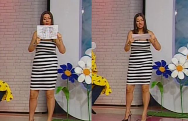 Pe parcursul emisiunii, prezentatoarea TV a fost preocupată să tragă încontinuu de rochia fără bretele în care părea că nu se simte tocmai confortabil.
