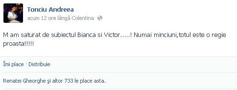 "M-am săturat de subiectul Bianca şi Victor! Numai minciuni, totul este o regie proastă!!!", a comentat Tonciu pe pagina personală de Facebook.