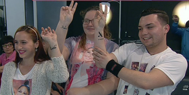 "Mi-am adus fanii de pe Facebook aici, câțiva, pentru că nu au loc toți. Sunt cei trei care s-au tatuat cu numele meu și cu logo-ul nou. Andreea s-a tatuat chiar azi. Memo, Carmen și Andreea. E tatuaj pe bune. Mai am fani în toată lumea care s-au tatuat cu numele meu, le mulțumesc pentru dragoste și susținere", a mărturisit Andra fericită la un post tv.