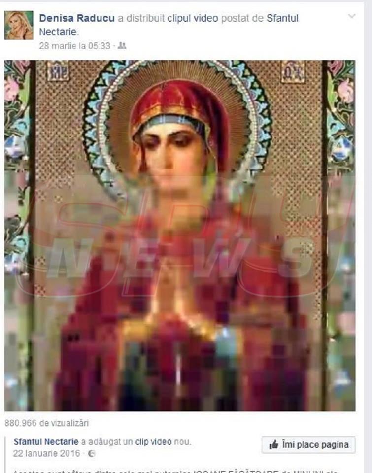 În urmă cu numai o lună, pe când nu se ştia de boala gravă de care suferă Denisa, artista a distribuit o o fotografie de pe o pagină religioasă, cea dedicată Sfântului Nectarie. Chiar dacă nu se plânge, este evident că blonda încearcă să lupte aşa cum mai poate.