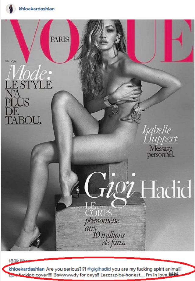 Khloe Kardashian a fost cucerită de pictorialul realizat de Gigi Hadid. Sora lui Kim Kardashian a postat pe o reţea de socializare coperta revistei "Vogue" pe care apare Gigi Hadid goală şi a mărturisit că s-a îndrăgostit de fotomodel.