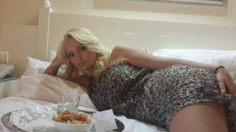Îmbrăcată într-o ţinută sexy, fotografia postată de ea pe contul de Facebook o surprinde întinsă pe un pat dintr-o cameră de hotel, în timp ce se delectează cu o gustare uşoară.