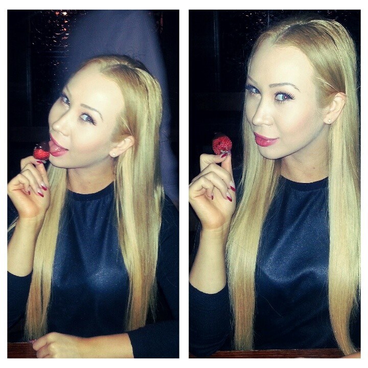 Blonda a luat în mnă o căpşună înmuiată în ciocolată şi a lins crema cu zâmbetul pe buze şi cu un gest destul de... porno, după care le-a arucat o privire incitantă fanilor.