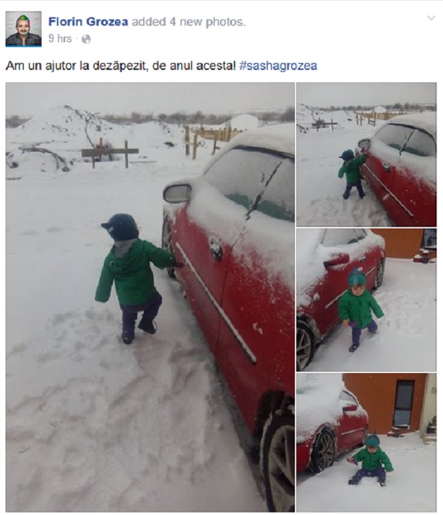 Cel care a dat jos zăpada de pe ea este chiar fiul să, Sasha, care, deşi de-abia ajungea la oglinzile retrovizoare, a fost harnic şi l-a ajutat pe tatăl său. Cu toate acestea, Florin Grozea a scris un mesaj greşit, pe Facebook. "Am un ajutor la dezăpezit, de anul acesta", a spus el, scriind "dezăpezit", în loc de "deszăpezit"
