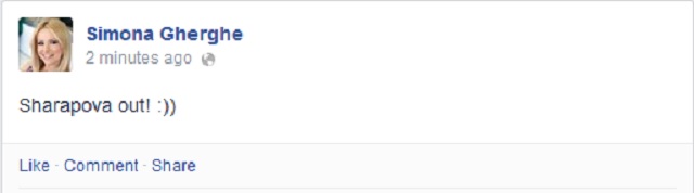 Simona Gherghe n-a rezistat şi a împărtăşit imediat informaţia cu prietenii de pe contul ei de socializare. "Sharapova, eliminată!", a scris ea, pe Facebook.