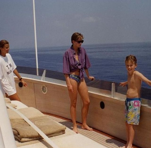 Prinţesa Diana apare într-o fotografie făcută pe iahtul prietenilor săi, Valentino şi Giancarlo Giammetti, îmbrăcată sumar, într-un costum de baie colorat. În partea de sus, prinţesa Diana a ales să poarte o cămaşă lejeră.