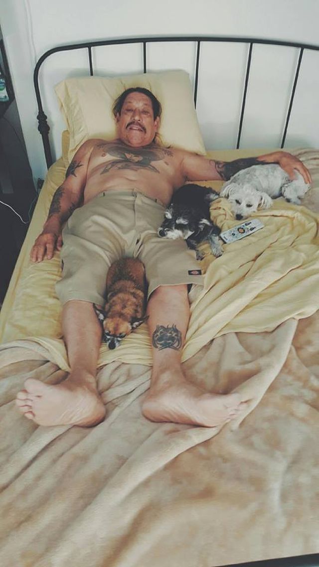 O imagine postată de actor pe Facebook a reuşit să uimească pe toată lumea. Danny Trejo apare în pat, destul de îmbătrânit, tolanit cu câteva animale lângă.