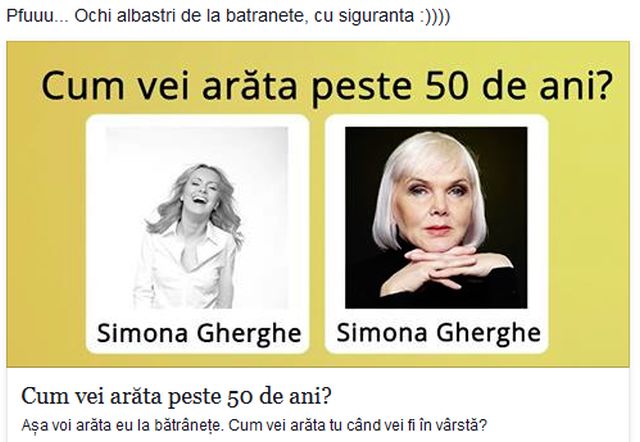Ei bine, la ultimul capitol, Simona Gherghe a pus la îndoială rezultatul aplicaţiei, căci are ochii căprui şi sunt slabe şanse, de fapt nule, să i se schimbe culoarea la bătrâneţe. Oricum, vedeta s-a amuzat copios pe marginea subiectului. "Pfuuu... Ochi albaştri de la bătrâneţe, cu siguranţă :))))", a menţionat vedeta.