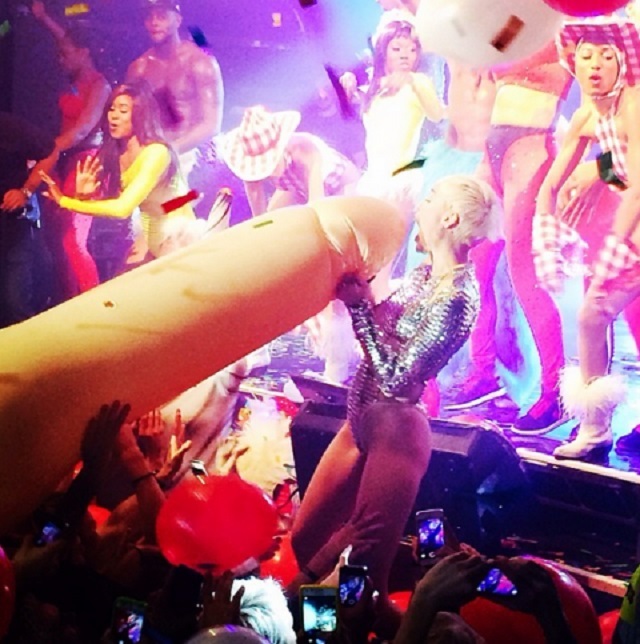Îmbrăcată într-un body argintiu, Miley s-a lăsat atinsă în zonele intime de către fani şi a simulat o scenă de sex oral cu o păpuşă gonflabilă. Aşadar, Miley s-a transformat din idolul copiilor într-o adevărată vedetă porno. Hmm, oare acum va deveni preferata bărbaţilor sau va reuşi să-şi alunge toţi fanii prin expunerile indecente?
