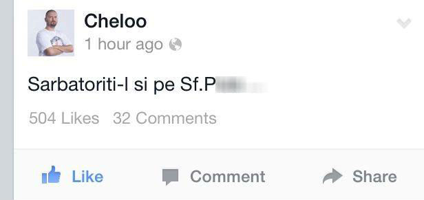 Fără inimioare, pluşuri sau ocolişuri, Cheloo le-a sugerat amatorilor de dulcegării să sărbătorească şi unul dintre organele ce contribuie la desăvârşirea fericirii de cuplu. Aşa cum, în trecut, se ridicau statui în formă de falus, poate că nu ar fi o idee rea importarea unei zile în care să se celebreze "Sfântul P***". Statusul postat de Cheloo pe Facebook a adunat foarte multe like-uri şi comment-uri, mai ales de la persoanele care nu au o afinitate specială pentru ziua "îndrăgostelii".