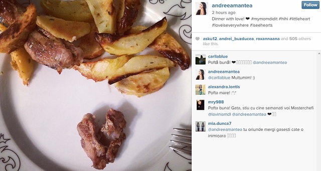 Astfel, graviduţa s-a delectat cu o porţie de cartofi cu pui la cuptor, iar din descrierea fotografiei, Andreea Mantea dă de înţeles că dragostea este peste tot şi că responsabilă de cina pregătită cu multă dragoste este mama ei.