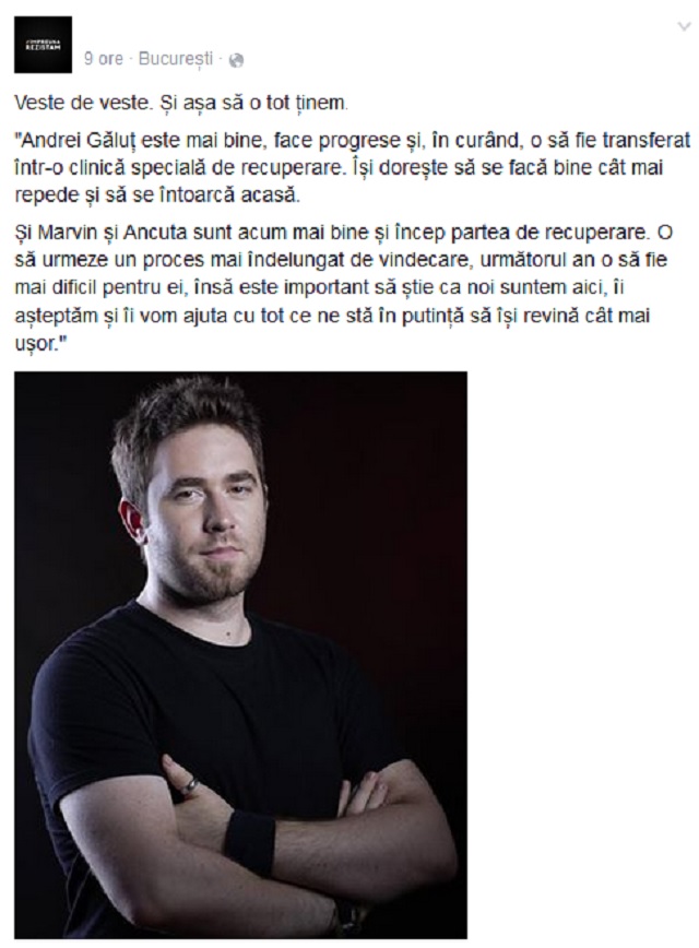 "Andrei Găluț este mai bine, face progrese și, în curând, o să fie transferat într-o clinică specială de recuperare. Își dorește să se facă bine cât mai repede și să se întoarcă acasă.