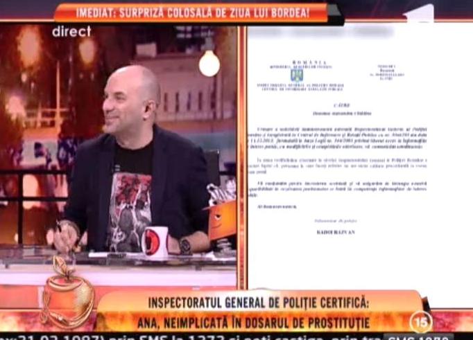 Asistenta de la "Un show păcătos", Ana Mocanu, a fost acuzată în urmă cu aproximativ o săptămână că ar fi primit suma de 5.000 de euro pentru o partidă de amor. în urmă cu câteva zile cei de la Poliţia Capitalei au trimis un certificat de "fată cuminte", aceştia au declarat printr-un act de oficial că roşcata nu are nicio legătură cu prostituţia. În această seară Dan Capatos a prezentat un nou act, de aceată dată de la Inspectoratul General al Poliţiei, act care atestă şi el că Ana nu este, şi nici nu a fost, împlicată în vreun act de prostituţie.
