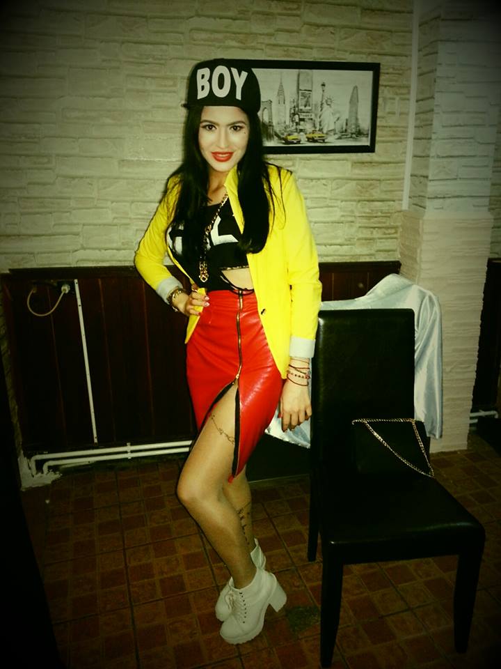 Tânăra cântăreaţă s-a îmbrăcat cu o bluză neagră ce-i scoate în evidenţă sânii mari şi cu o fustă sexy, roşie, din latex, cu crăpătură adâncă. Se pare că bruneta e conştientă că bagă bărbaţii-n boală cu formele ei şi că le face pe femei invidioase. "De -ar avea dusmanii putere..m-ar taia m-ar face lemne!", a scris ea, pe contul de socializare.