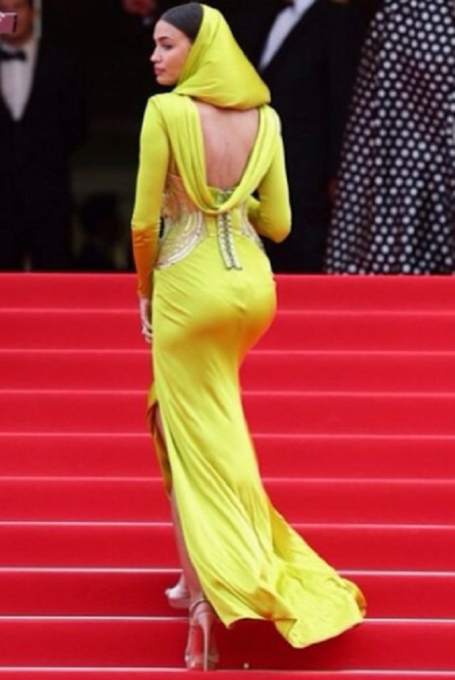 Iubita lui Cristiano Ronaldo a îmbrăcat o rochie de culoare galbenă, lungă şi cu crăpătură pe picior. Ţinuta îi scotea perfect în evidenţă fundul Irinei, iar paparazzii au sărit cu aparatele foto pe ea. Mai mult, rochia avea un fel de glugă şi astfel Irina şi-a prins părul într-un coc. Modelul a publicat pozele pe contul de Instagram, acolo unde like-uri au curs râuri din partea admiratorilor.