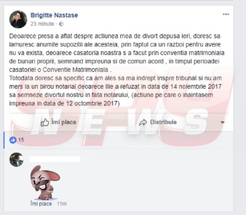 "Deoarece presa a aflat despre acţiunea mea de divorţ depusă ieri, doresc să lămuresc anumite supoziţii ale acesteia, prin faptul că un război pentru avere nu va exista, deoarece căsătoria noastră s-a facut prin convenţia matrimonială de bunuri proprii, semnând împreună şi de comun acord, în timpul perioadei căsătoriei o Conventie Matrimonială. Totodată doresc să specific că am ales să mă îndrept înspre tribunal şi nu am mers la un birou notarial deoarece Ilie a refuzat în data de 14 noiembrie 2017 să semneze divorţul nostru în faţa notarului, (acţiune pe care o înaintasem împreună în data de 12 octombrie 2017)", a scris Brigitte Sfăt.