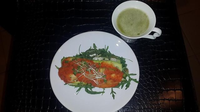"Lasagna cu dovlecei, roşii proaspete şi uscate, ciuperci, cremă de caju, pesto de busuioc, masline, vlastari şi suc de ananas, ginger, coriandru ( busuioc), psyllium, Eco Green Multivit. O cina uşoară şi sănătoasă!", a scris Andreea Marin pe Facebook, unde a postat imaginea de mai jos.