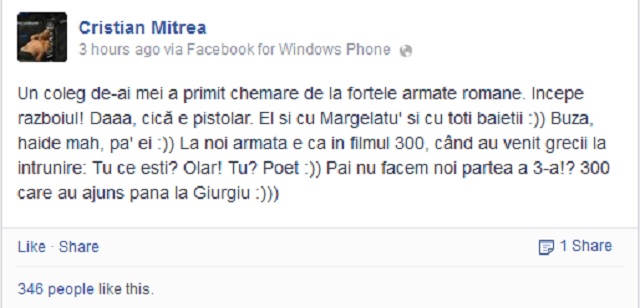 ”Un coleg de-ai mei a primit chemare de la Forțele Armate Române. Începe războiul! Daaa, cică e pistolar. El și cu Mărgelatu' și cu toți baieții :)) Buza, haide măh, pa' ei :)) La noi armata e că în filmul 300, când au venit grecii la întrunire: Tu ce ești? Olar! Tu? Poet :)) Păi nu facem noi partea a 3-a!? 300 care au ajuns până la Giurgiu :)))”, a scris Cristi Mitrea pe rețeaua de socializare.