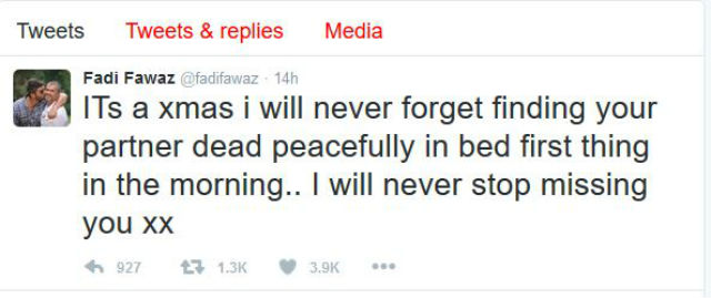 Se pare că Fadi Fawaz nu mai scrisese pe contul de Twitter din septembrie 2015. Cântăreţul, George Michael a murit la 53 de ani, chiar în ziua de Crăciun din cauza unei insuficienţe cardiace.