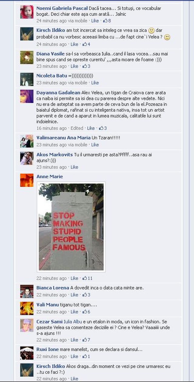 Iulia Albu a postat recent pe pagina personală de Facebook pasajul în care Velea o făcea praf. Criticul de modă a fost vizibil deranjată de atitudinea artistului şi de vocabularul destul de colorat. Fanii Iuliei s-au întrecut în comentarii şi l-au făcut praf pe Velea. Cu toate acestea s-au găsit câţiva cârcotaşi care i-au dat dreptate cântăreţului. "Dar el cum arată? Este jalnic", "Velea este un ţigan din Craiova care arată ca naiba", "Vai de capul lui de cocalar, să se uite în oglindă", "Şi totuşi şi-a modificat tatuajul ăla cu virgulă în plus?", au scris fanii Iuliei Albu pe contul de socializare.