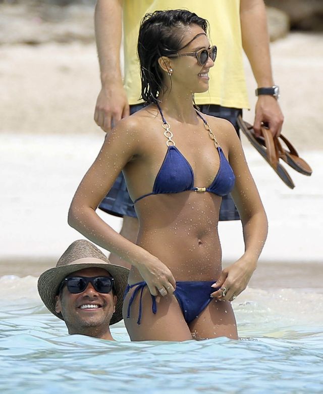 Îmbrăcată într-un costum de baie minuscul, de culoare albastră, Jessica Alba şi-a etalat trupul perfect. Bikinii minusculi i-au ridicat mari probleme şi a fost nevoită să stea mai mereu cu mâna pe ei ca să nu-i scape.