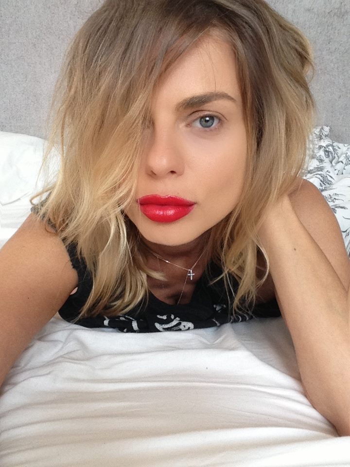 Întinsă în pat, îmbrăcată cu un maieu negru, cu părul răvăşit şi cu decolteul la "înaintare", Jojo a privit incitant şi şi-a ţuguiat puţin buzele mari, de un roşu aprins. Ca buzele apetisante să-i iasă şi mai tare în evidenţă, Jojo a renunţat de tot la fardurile pentru ochi, adoptând un look natural. Actriţa i-a anunţat pe fani că se pregăteşte, deja, de o petrecere la care urmează să meargă în seara asta.
