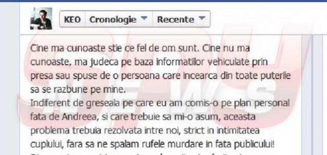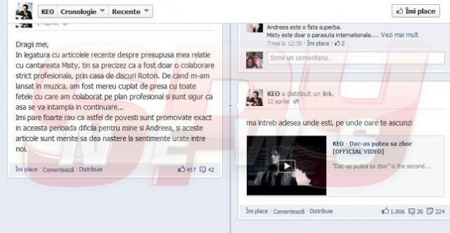 „În legătură cu articolele recente despre presupusa mea relaţie cu cântăreaţa Misty, ţin să precizez că a fost doar o colaborare strict profesională, prin casa de discuri Roton. (...) Îmi pare foarte rău că astfel de poveşti sunt promovate exact în această perioadă dificilă pentru mine şi Andreea, şi aceste articole sunt menite să dea naştere la sentimente urâte între noi”, nota Keo pe contul său de socializare.