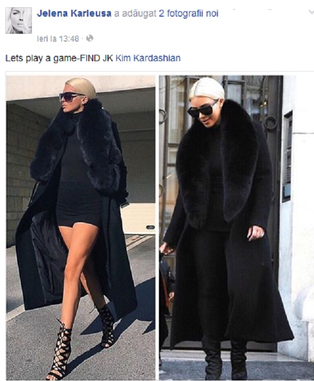 Indignată de faptul că este copiată de Kim Kardashian, artista a postat pe o reţea de socializare mai multe materiale apărute în presa internaţională, în care este semnalată gafa soţiei lui Kanye West. Mai mult decât atât, Jelena Karleusa a postat o imagine cu ea, însoţită de mesajul: "Originalul". O altă postare de-a cântăreţei este însoţită de mesajul "Să înceapă jocul", semn că faptul că este copiată de Kim Kardashian o deranjează destul de tare.
