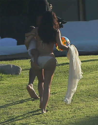 Bruneta a fost surprinsă în timp ce se întorcea de la plajă, alături de micuţa North, pe care cu greu o ţinea în braţe.
