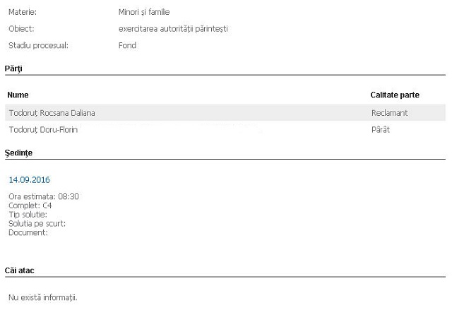 Femeia cere în instanţă „exercitarea autorităţii părinteşti”. Mai exact, Rocsana îşi doreşte ca magistraţii să îi dea custodia celor trei fetiţe, să îl oblige pe Doru la plata pensiei alimentare şi să-i stabilească acestuia un program de vizitare a minorelor. Mai mult decât atât, chiar dacă Doru Todoruţ spera să nu o mai vadă vreodată în faţa ochilor, artistul va fi nevoit să dea nas în nas cu cea care i-a fost soţie, la jumătatea lunii septembrie, la tribunal