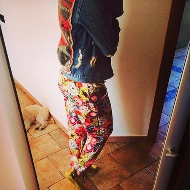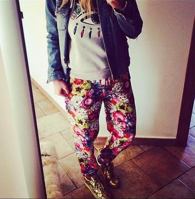 Delia, "împinsă" probabil de la spate de vremea frumoasă de afară, a ales să poarte în această zi o ţinută extrem de veselă, colorată. Într-o pereche de pantaloni subţiri, cu flori, o bluză la fel de veselă şi cu teneşi aurii, Delia şi-a pozat ţinuta după care a ieşit pe uşă.