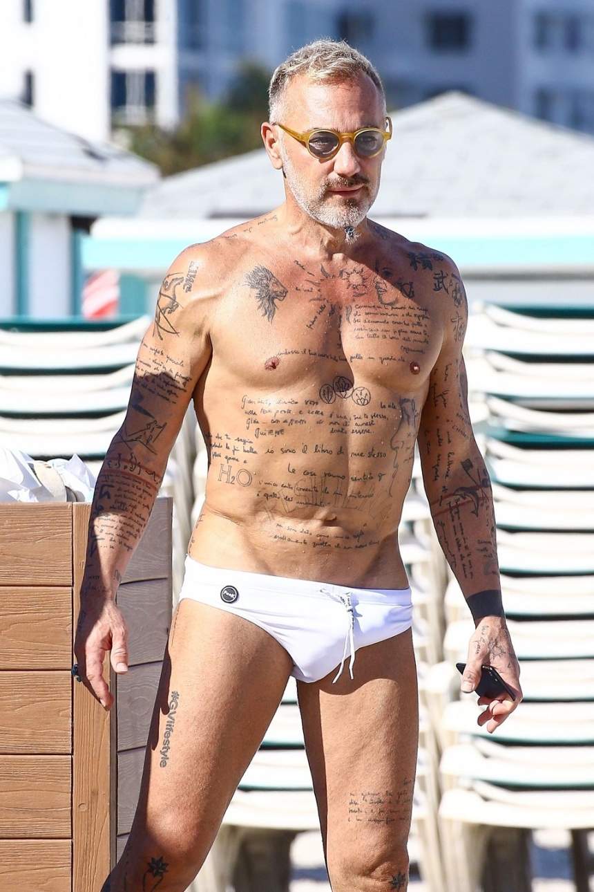 Excentricul milionar italian a fost surprins duminică pe o plajă din Miami. Aşa cum ne-a obişnuit, Gianluca Vacchi nu a ratat şansa să îşi etaleze tatuajele, dar şi corpul bine lucrat în sala de sport. Acesta a purtat o pereche de slipi albi şi ochelari de culoare galbenă.