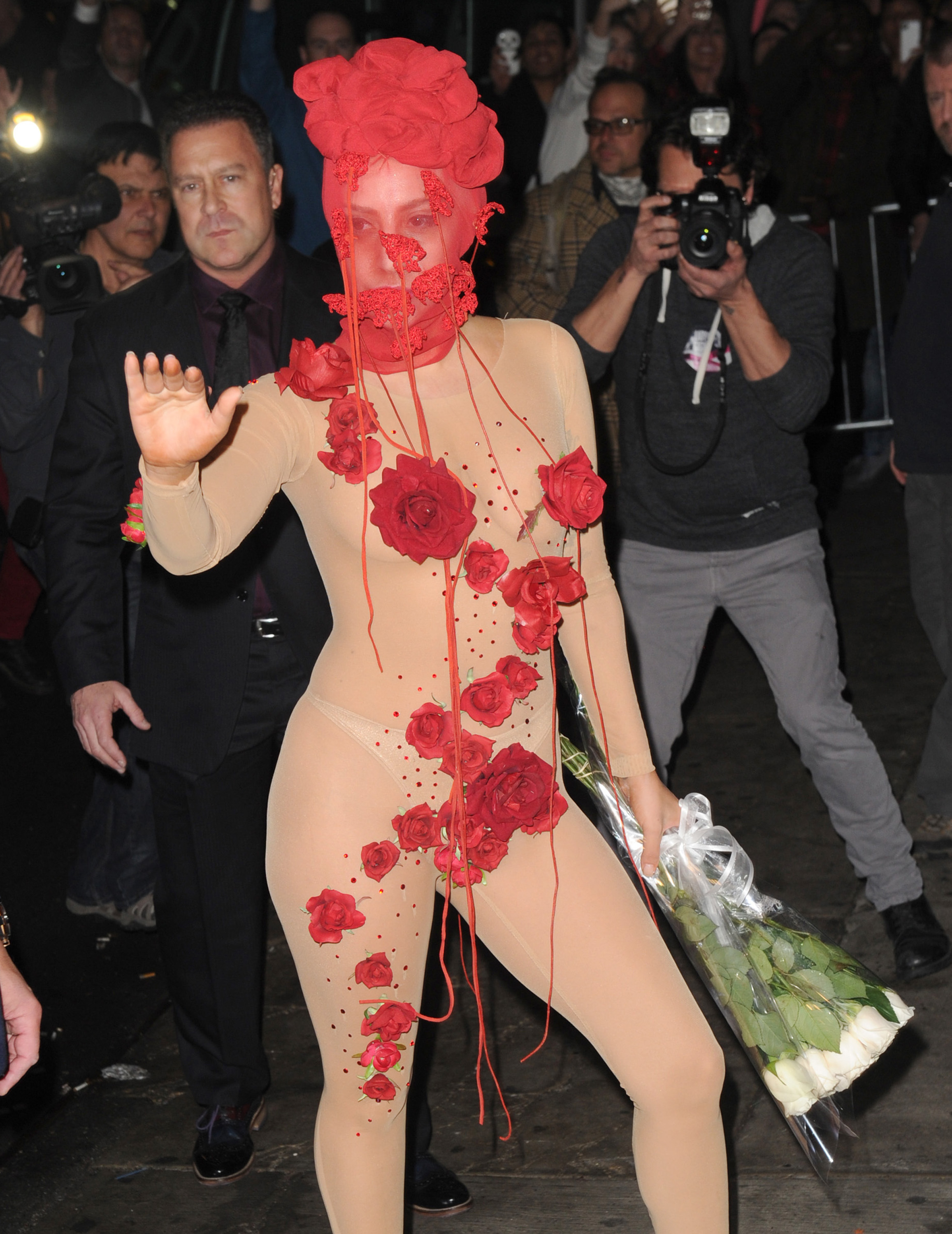 Cu faţa mai acoperită decât corpul, artista a defilat pe covorul roşu. A atras toate privirile prin ţinuta care lăsa la vedere tot. Într-o salopetă transparentă, Lady Gaga a avut acoperite părţile intime cu nişte trandafiri aplicaţi. Cu toate că face mult sport, diva e plină de celulită, iar sânii îi sunt lăsaţi.