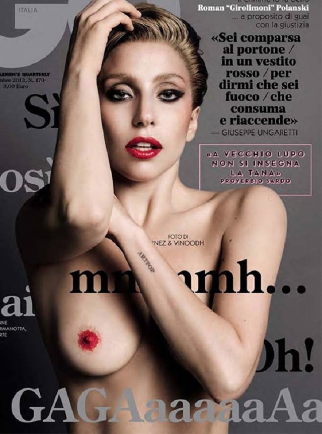 Cântăreaţa a renunţat din nou la haine şi i-a făcut pe italieni să-şi piardă minţile. Lady Gaga a acceptat să apară goală pe coperta unei reviste pentru bărbaţi. Blondina şi-a vopsit un sfârc cu roşu, pentru a se asorta perfect cu rujul de pe buze. Machiată în exces, Gaga ţine buzele întredeschise pentru a fi cât mai provocatoare.