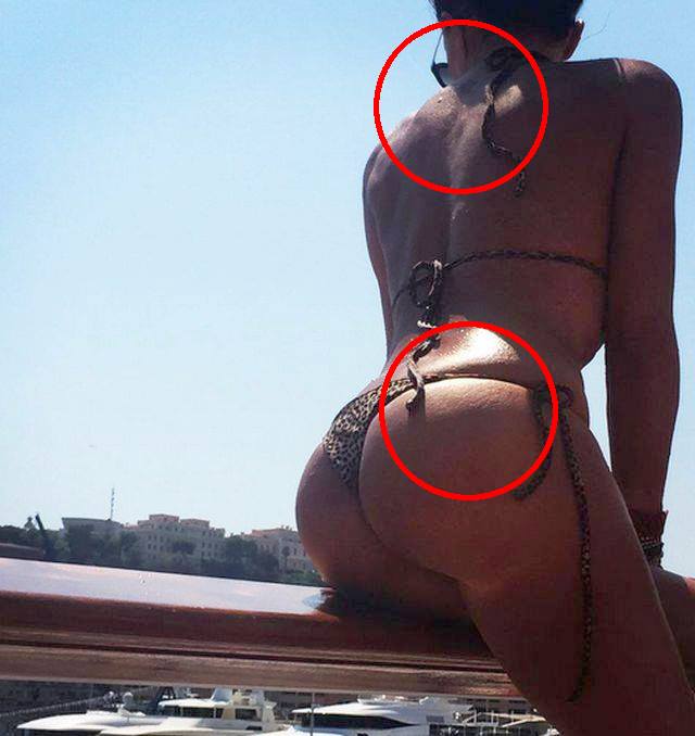 Numai că, surpriză, în imagini se poate observa cum vedeta are vergeturi chiar pe funduleţul obrazic pe care îl arată cu atâta mândrie.