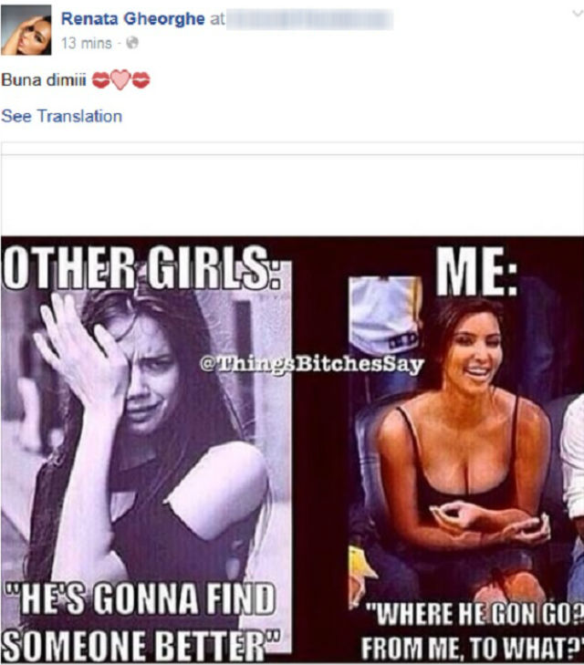 Renata a pus două poze - una cu o fată plângând, în dreptul căreia scrie cum gândesc cele mai multe tinere: "O să-şi găsească o femeie mai bună decât mine" şi alta cu o fată îmbrăcată sumar, râzând, în dreptul căreia stă scrisă o replică pe care Renata sugerează că ar folosi-o în aceste momente: "Unde s-a dus? De la mine, la cine?!", dând de înţeles că ea nu suferă deloc după Leo, Odată cu mesajul, Renata le-a urat "Bună dimineaţa!" prietenilor virtuali.