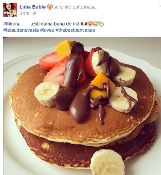 "Miruna, eşti numa' bună de măritat. Te iau de nevastă. Te iubesc. Cele mai bune clătite", este mesajul care însoţelte imaginea postată de Lidia Buble pe o reţea de socializare.
