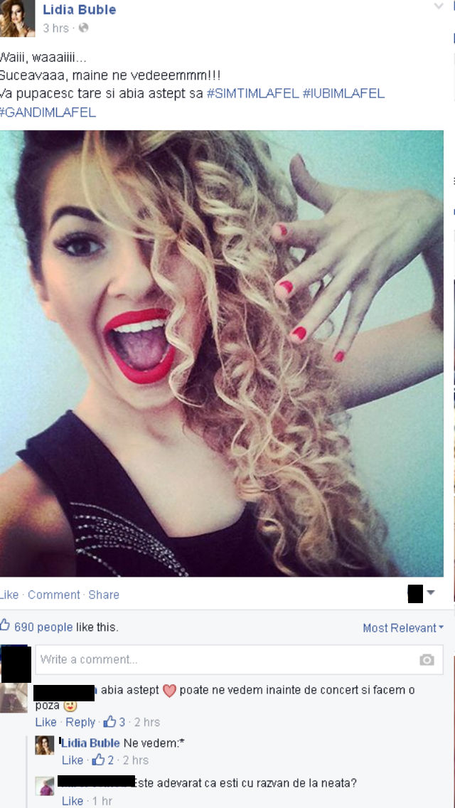 Lidia Buble a fost luată la întrebări de admiratori asta după ce în presă au apărut informaţii conform cărora ea şi Răzvan Simion, moderatorul matinalului de la Antena 1 ar avea o relaţie.