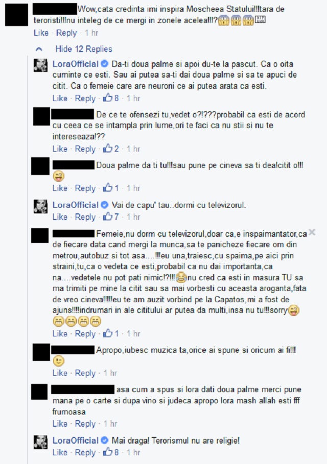"E o perioadă foarte grea pentru adevăraţii mulsumani. Lumea suferă din cauza imaginii negative create pentru a exista motiv de ură şi război. Musulmanii iubesc creştinii. Coranul şi Biblia sunt foarte asemănătoare. Din păcate minţile înguste sunt manipulate şi încărcate cu ură. Păcat! Trist!", a scris Lora.