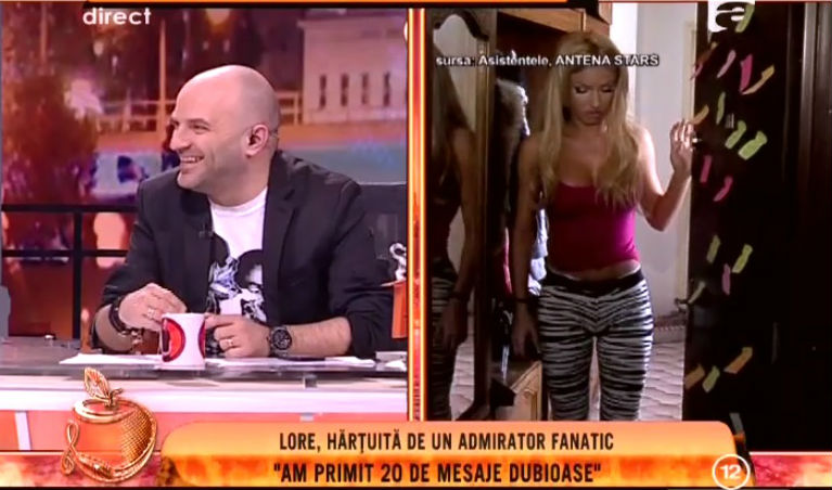 "Sunt foarte speriată. Dacă nu e colega mea de apartament acasă, când vin de la emisiune, seara, mie îmi este frică să rămân singură. Este un obsedat, mi-a lipit uşa cu bileţele. Măcar de îmi lăsa un X6 la uşă", i-a spus Loredana Chivu lui Dan Capatos.