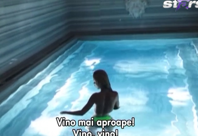 Loredana a simţit nevoia să se răcorească după cele şapte minute "de groază" pe care le-a petrecut la saună, aşa că a înotat într-o piscină îmbrăcată extrem de sexy, într-un costum de baie cu sutien şi slipi mici. Ana Mocanu îi făcea poze cu telefonul mobil, de pe margine.