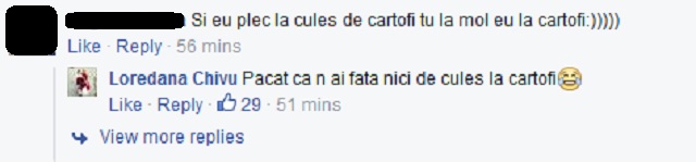 "Şi eu plec la cules de cartofi. Tu la mall, eu la cartofi", a spus bărbatul. Răspunsul Loredanei a fost apreciat de multe persoane şi l-a lăsat pe bărbat fără replică: "Păcat că nu ai faţă nici de cules la cartofi".