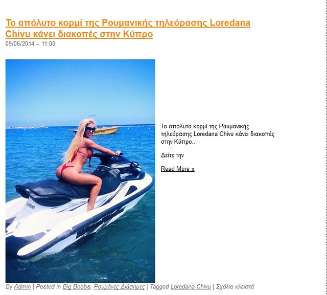 Loredana Chivu şi Ana Maria Mocanu s-au răsfăţat pe plajele din Cipru. Şi-au expus formele bine conturate, în costume de baie minuscule. Se pare că locuitorii insulei au fost impresionaţi de "dotările" Loredanei, ale cărei poze le-au inserat într-un articol. "Vedetă de televiziune din România, vacanţă în Cipru", au scris ziariştii ciprioţi.